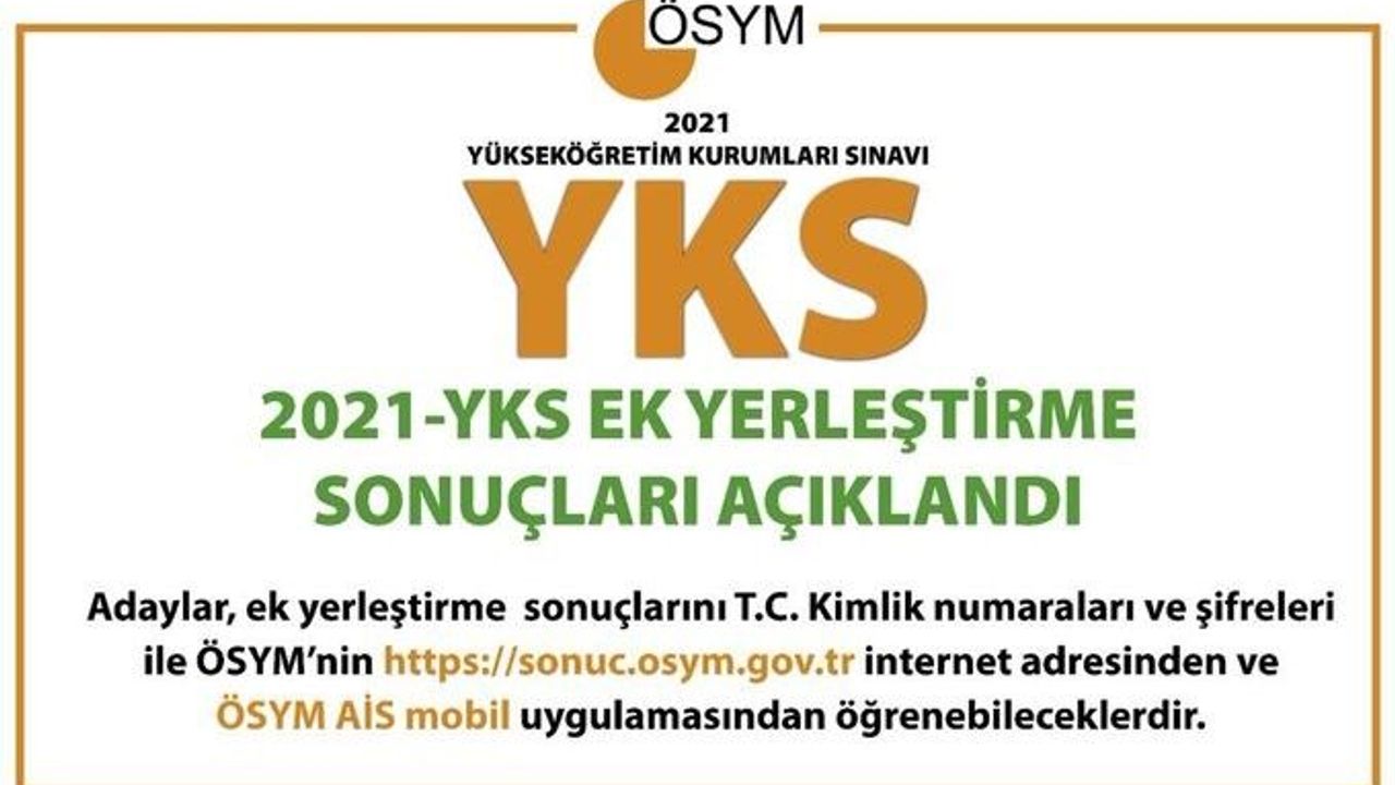 Ölçme, Seçme ve Yerleştirme Merkezi (ÖSYM) Başkanı Prof. Dr. Halis Aygün, sosyal medya hesabından "20-23 Eylül 2021 tarihleri arasında tercihlerini aldığımız 2021-YKS ek yerleştirme sonuçları açıklanmıştır. Adaylarımız sonuçlarını http://sonuc.osym.gov.tr adresimizden ve ÖSYM AİS mobil uygulamamızdan öğrenebilirler. Sonuçların adaylarımıza ve ailelerine hayırlı olmasını diliyorum" açıklamasını yaptı.