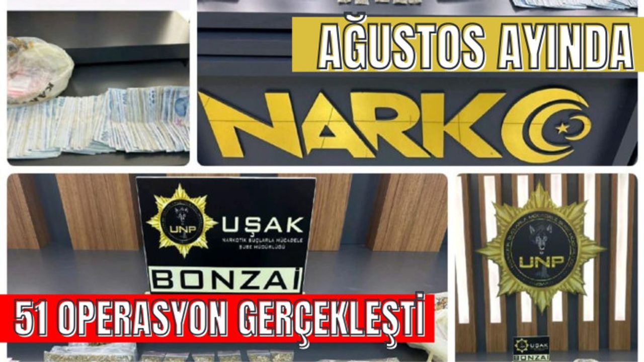 Uşak Emniyet Müdürlüğü Narkotik Suçlarla Mücadele Şube Müdürlüğü ekipleri tarafından Ağustos ayında yapılan 51 operasyonda 29 bin 189 sentetik ecza, bin 527 metafetamin, 664 Ecstasy yakalandı.
