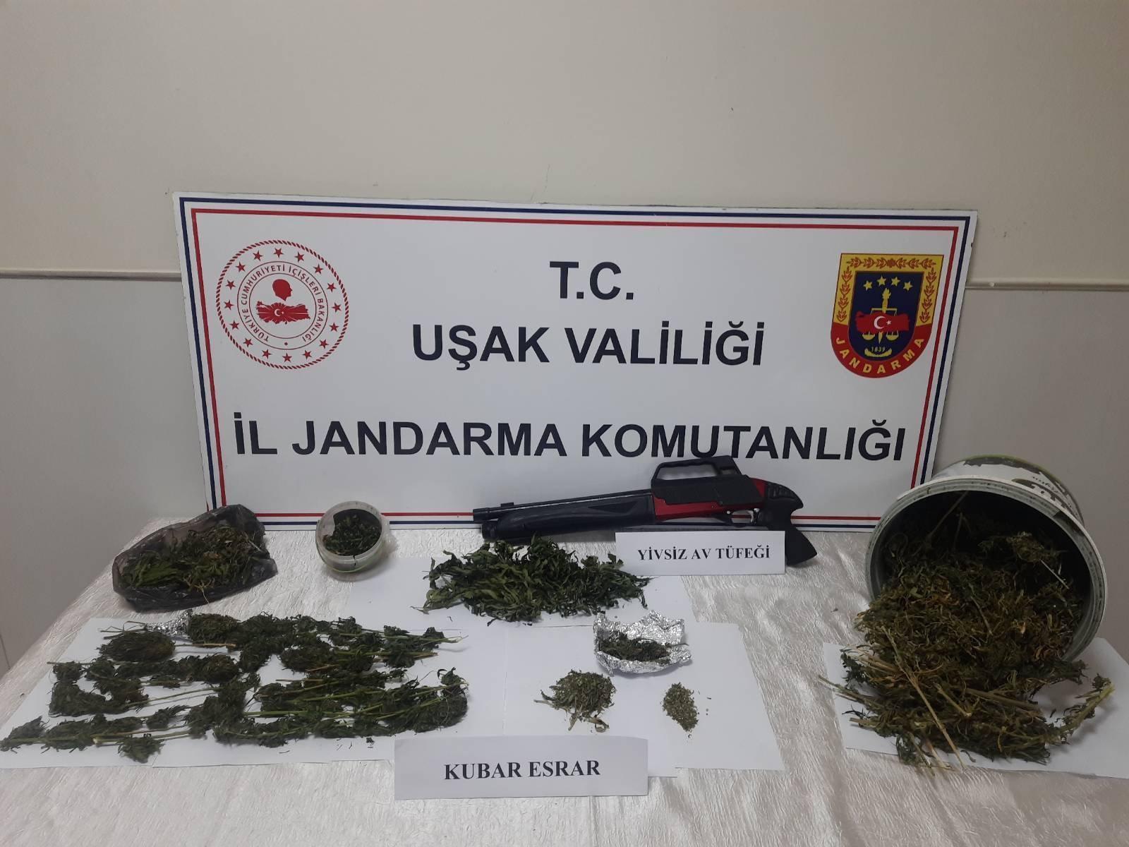 Uşak İl Jandarma Komutanlığı ekipleri, Banaz Cumhuriyet Başsavcılığı koordinesinde yürütülen titiz çalışmalar sonucunda uyuşturucu madde ticaretine yönelik önemli bir operasyona imza attı. Banaz ilçesinde M.A.S. isimli şüphelinin ikametinde ve bağ evinde yapılan adli aramada 828 gram kubar esrar, 1 ruhsatsız av tüfeği, 1 uyuşturucu madde kullanma aparatı, 1 makas ve 1 alüminyum folyo ele geçirildi.