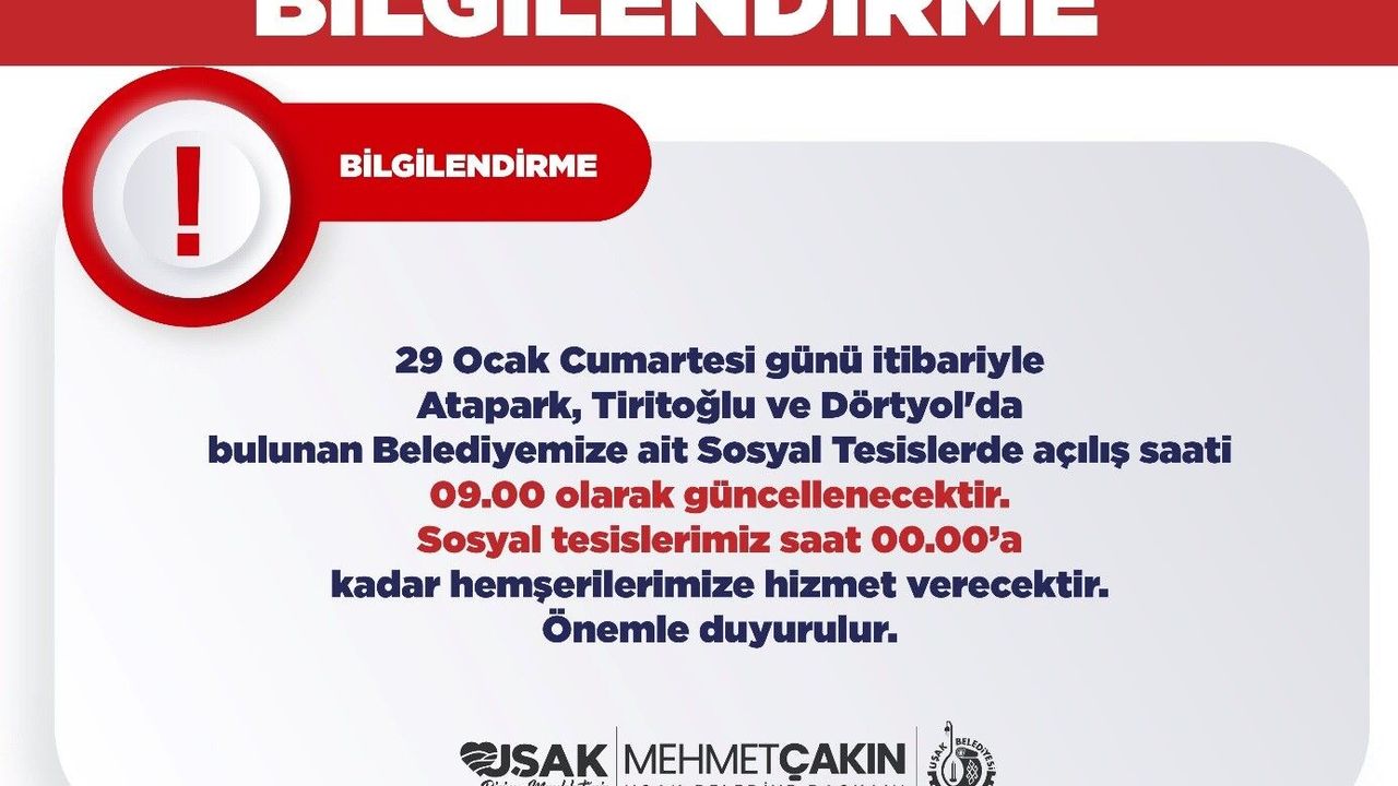 Uşak Belediyesinden yapılan açıklamada, ‘’29 Ocak Cumartesi günü itibariyle Atapark, Tiritoğlu ve Dörtyol'da bulunan Belediyemize ait Sosyal Tesislerde açılış saati 09.00 olarak güncellenecektir. Sosyal tesislerimiz saat 00.00’a kadar hemşerilerimize hizmet verecektir. Önemle duyurulur.’’ Denildi..