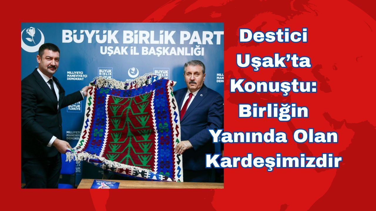 Büyük Birlik Partisi (BBP) Genel Başkanı Mustafa Destici, bir dizi ziyaret kapsamında geldiği Uşak’ta partisinin yeni il başkanlığı binasının açılışını gerçekleştirdi. Açılışın ardından basın mensuplarına açıklamalarda bulunan Destici, birlik ve beraberlik vurgusu yaparak, etnik köken ya da mezhep üzerinden ayrımcılığı reddettiklerini söyledi.