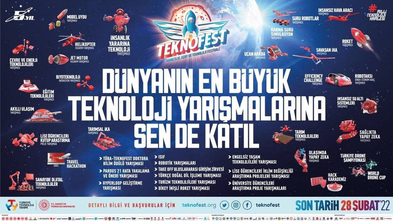 Dünyanın en büyük havacılık, uzay ve teknoloji festivali TEKNOFEST, T.C Sanayi ve Teknoloji Bakanlığı ve Türkiye Teknoloji Takımı Vakfı yürütücülüğünde, Türkiye’nin önde gelen teknoloji şirketleri, kamu, medya kuruluşları ve üniversitelerin destekleriyle düzenlenmektedir. Teknoloji ve bilime yönelik toplumda farkındalık oluşturmayı ve Türkiye’nin bilim ve mühendislik alanlarında yetişmiş insan kaynağını artırmayı hedefleyen TEKNOFEST, gençlerin geleceğin teknolojileri üzerinde çalışmalarını desteklemek için roketlerden otonom sürüş sistemlerine, insansız hava araçlarından sualtı sistemlerine teknolojinin birçok alanında düzenlenen yarışmalar başta olmak üzere, çeşitli etkinliklere ev sahipliği yapmaktadır.