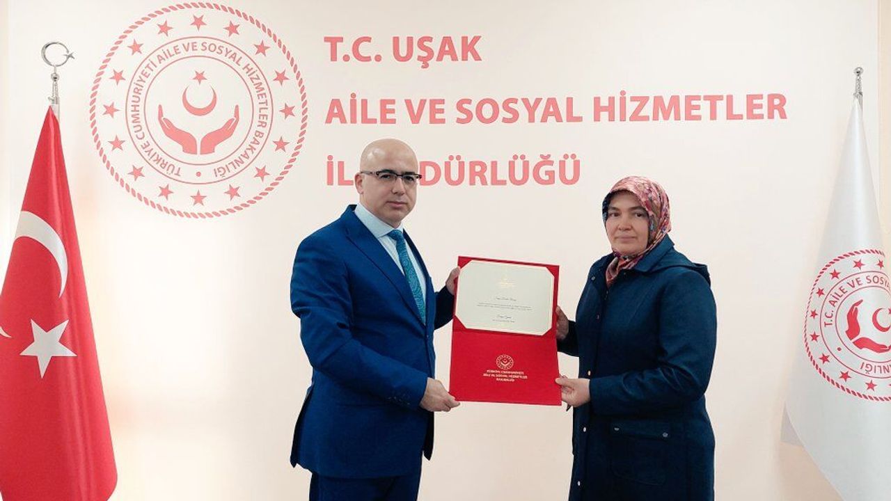 Uşak Aile ve Sosyal Hizmetler Müdürlüğünde emekli olan çalışma arkadaşlarına Müdür Ekrem Boran tarafından Bakan Derya Yanık’ın gönderdiği teşekkür beratlarını verdi.