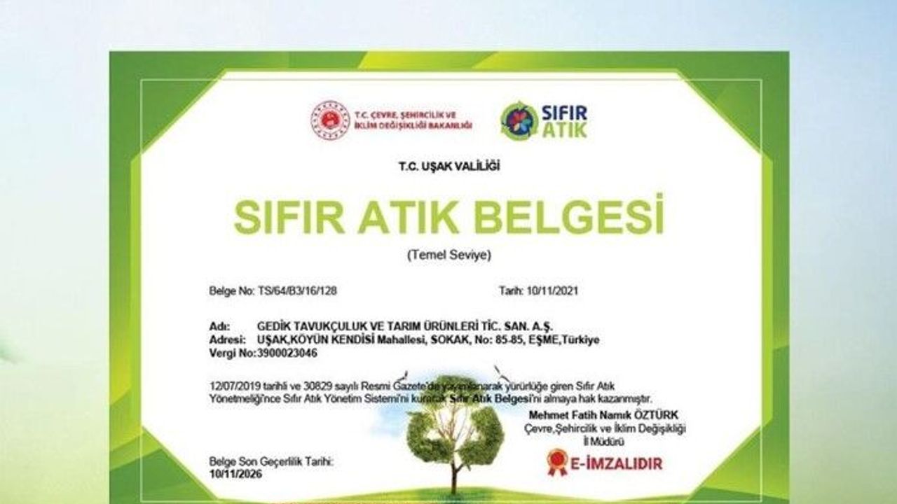 Uşak Valiliği aralığıyla Gedik Piliç’e takdim edilen belgede, “Gedik Tavukçuluk ve Tarım Ürünleri Tic. San. A.Ş; 12 Temmuz 2019 tarihli ve 30829 sayılı Resmi Gazete’de yayımlanarak yürürlüğe giren Sıfır Atık Yönetmeliğince ‘Sıfır Artık Yönetim Sistemi’ni kurarak ‘Sıfır Atık’ belgesini almaya hak kazanmıştır” ifadelerine yer verildi.