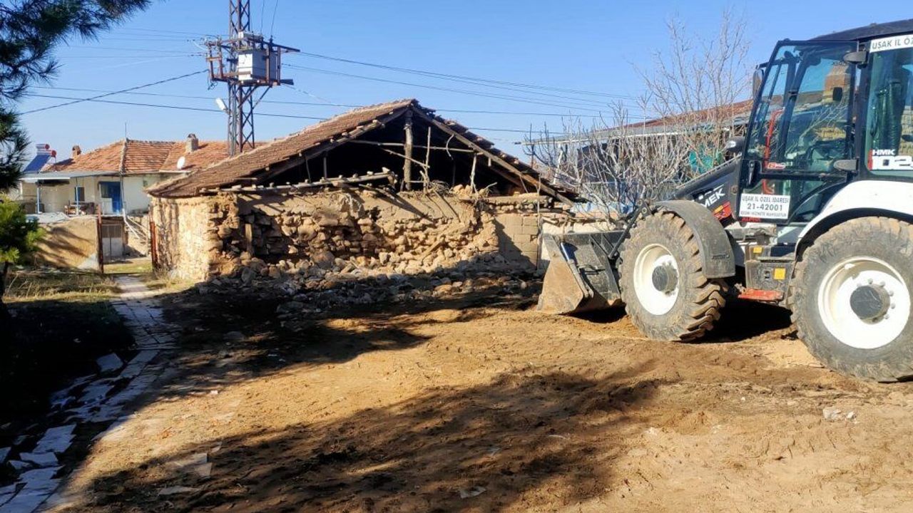 Uşak'ta Karahallı ilçesine bağlı tehlike arz eden metruk binalar İl Özel İdaresi personeline kontrollü bir şekilde yıkıldı.