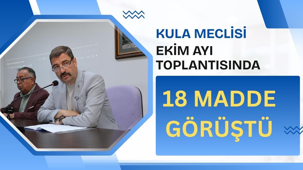 Kula Belediyesi’nin Ekim ayı olağan meclis toplantısı, Belediye Başkanı Hikmet Dönmez’in başkanlığında Belediye Ek Hizmet Binası Toplantı Salonu’nda gerçekleştirildi. Toplantı, saygı duruşu ve İstiklal Marşı’nın okunmasıyla başladı. Meclis üyelerinin eksiksiz katılım gösterdiği oturumda, gündemdeki 16 ana maddeye ek olarak son dakika önerileriyle gündeme alınan 2 ek madde olmak üzere toplam 18 konu masaya yatırıldı.
