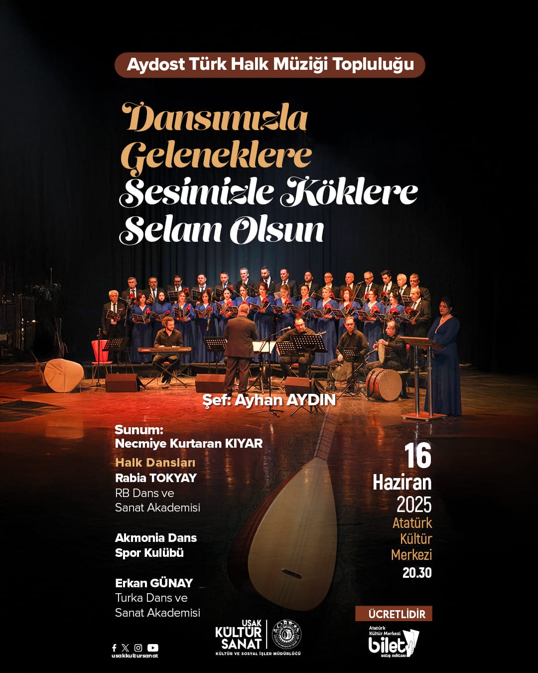 Uşak’ın kültür sanat takvimi, bir kez daha unutulmaz bir etkinliğe sahne olmaya hazırlanıyor. Uşak Belediyesi Kültür ve Sosyal İşler Müdürlüğü öncülüğünde faaliyet gösteren Aydost Türk Halk Müziği Topluluğu, 16 Haziran 2025 Pazartesi akşamı saat 20.30’da Atatürk Kültür Merkezi’nde sanatseverlerle buluşacak.