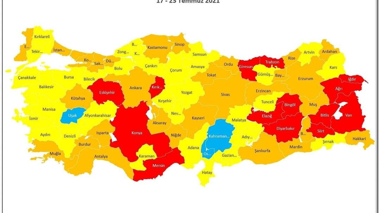 Sağlık Bakanlığı'nın açıkladığı 17-23 Temmuz tarihli haritada, vaka oranı yüz binde 17,59'a gerileyen Uşak'ın rengi yeniden mavi oldu. İki hafta öncesine kadar 100 binde yüzde 20,84 vaka oranına sahip Uşak'ta yapılan sıkı denetimler ve vatandaşların kurallar ile tedbirlere uyması, vaka oranının yüzde 17,59'lara gerilemesini sağladı. Uşak dışında vaka risk haritasına göre Akdeniz Bölgesi'nden, Osmaniye ile Kahramanmaraş düşük riskli iller arasında yer aldı. Uşak Valisi Funda Kocabıyık ise sosyal medya hesabından yaptığı açıklamada, salgınla mücadelenin kararlılıkla devam edeceğini söyledi. Aşı olun çağrısı yapan Vali Kocabıyık, "Risk durumuna göre ilimiz mavi kategoride yer alıyor.