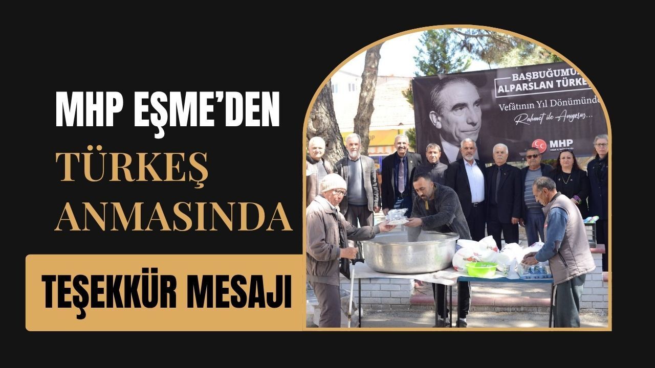 Milliyetçi Hareket Partisi (MHP) Uşak Eşme İlçe Başkanlığı, merhum Alparslan Türkeş’in vefat yıl dönümü dolayısıyla düzenlenen anma programının ardından bir teşekkür mesajı yayımladı. İlçe teşkilatı tarafından gerçekleştirilen pilav ikramı programına çok sayıda vatandaşın yanı sıra ilçe protokolü ve siyasi parti temsilcileri katıldı. Programda, Türkeş ve tüm şehitler için dualar edildi.