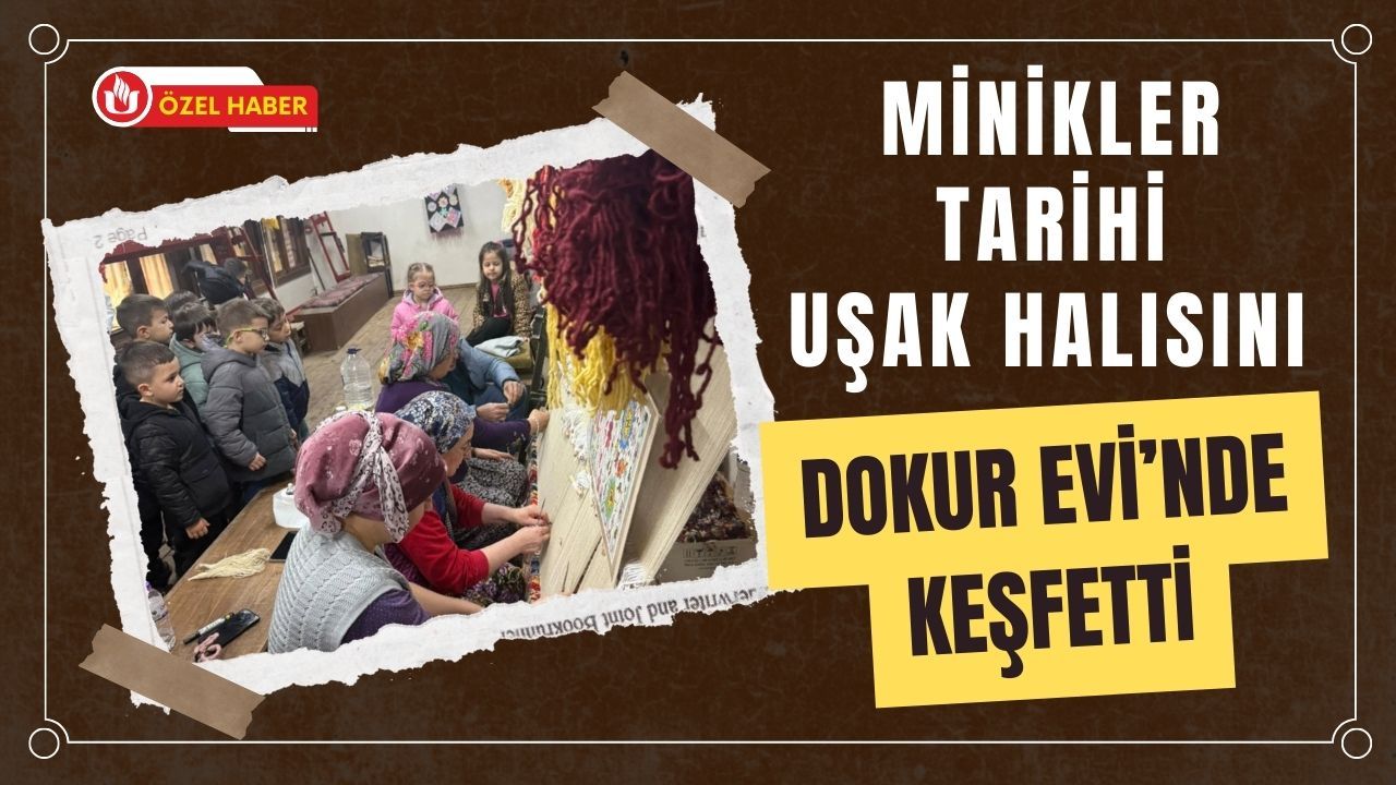 Restorasyon sonrası halı dokuma atölyesine dönüştürülen Dokur Evi’nde, İŞKUR protokolüyle yaklaşık 50 kursiyer tarafından 14., 15. ve 17. yüzyıllarda dünyada büyük ilgi gören otantik Uşak halıları yeniden dokunuyor. Minikler, kursiyerlerin dokuma tezgâhlarında yürüttüğü çalışmaları yakından inceleyerek Uşak halısının desenlerini, renk kültürünü ve tarihsel önemini yerinde öğrendi.