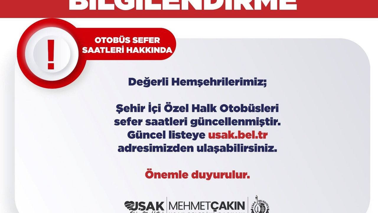 Uşak Belediyesi yaptığı açıklamada ‘’Değerli Hemşehrilerimiz; Şehir İçi Özel Halk Otobüsleri sefer saatleri güncellenmiştir. Güncel listeye https://usak.bel.tr adresimizden ulaşabilirsiniz. Önemle duyurulur.’’ Denildi.