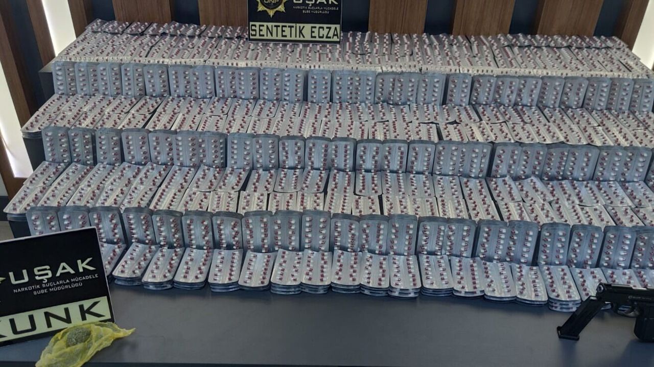 Uşak İl Emniyet Müdürlüğüne bağlı Narkotik Suçlarla Mücadele Şube Müdürlüğü ekipleri, bir şahsın uyuşturucu ticareti amaçlı kente uyuşturucu madde getireceği bilgisine ulaştı. Bilgiler doğrultusunda kontrol noktasında durdurulan şehirlerarası yolcu otobüsünde arama yapıldı. Aramada Y.T.'ye ait olduğu tespit edilen bir koliden 16 bin 800 sentetik ecza hap, 13 gram skunk uyuşturucu maddesi ve 1 adet ruhsatsız tabanca bulunurken şüpheli şahıs da ekiplerce gözaltına alındı. Emniyetteki işlemlerin ardından adliyeye sevk edilen şahıs, çıkarıldığı mahkemece tutuklanarak cezaevine gönderildi.