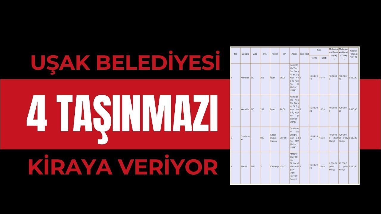 Uşak Belediyesi, mülkiyeti kendisine ait 4 ayrı taşınmazın kiraya verileceğini duyurdu. 2886 Sayılı Devlet İhale Kanunu’nun 45. maddesi kapsamında gerçekleştirilecek ihaleler, açık artırma usulüyle yapılacak. İhale sürecine ilişkin yapılan bilgilendirmeye göre, taşınmazların kiralama ihaleleri 15 Nisan 2026 tarihinde, Sarayaltı Mahallesi Celal Bayar Caddesi No:80 B Blok 5. katta bulunan Belediye Encümeni odasında gerçekleştirilecek.