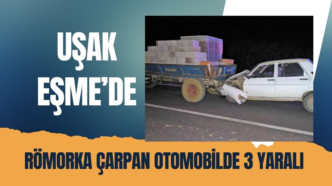 Uşak’ın Eşme ilçesinde meydana gelen trafik kazasında, traktörün römorkuna çarpan otomobilde bulunan üç kişi yaralandı. Kaza, Ağabey köyü yakınlarında yaşandı. Edinilen bilgilere göre, N.G. (62) yönetimindeki 64 EC 467 plakalı otomobil, seyir halindeyken N.G. (58) idaresindeki 64 ED 702 plakalı traktörün römorkuna çarptı. Çarpmanın etkisiyle otomobilde bulunan kişiler yaralandı. Kazanın ardından yapılan ihbar üzerine olay yerine sağlık ve jandarma ekipleri sevk edildi. Yaralanan otomobil sürücüsü ile araçta bulunan N.F. (73) ve C.K. (63), ambulanslarla Eşme Devlet Hastanesi’ne kaldırıldı.