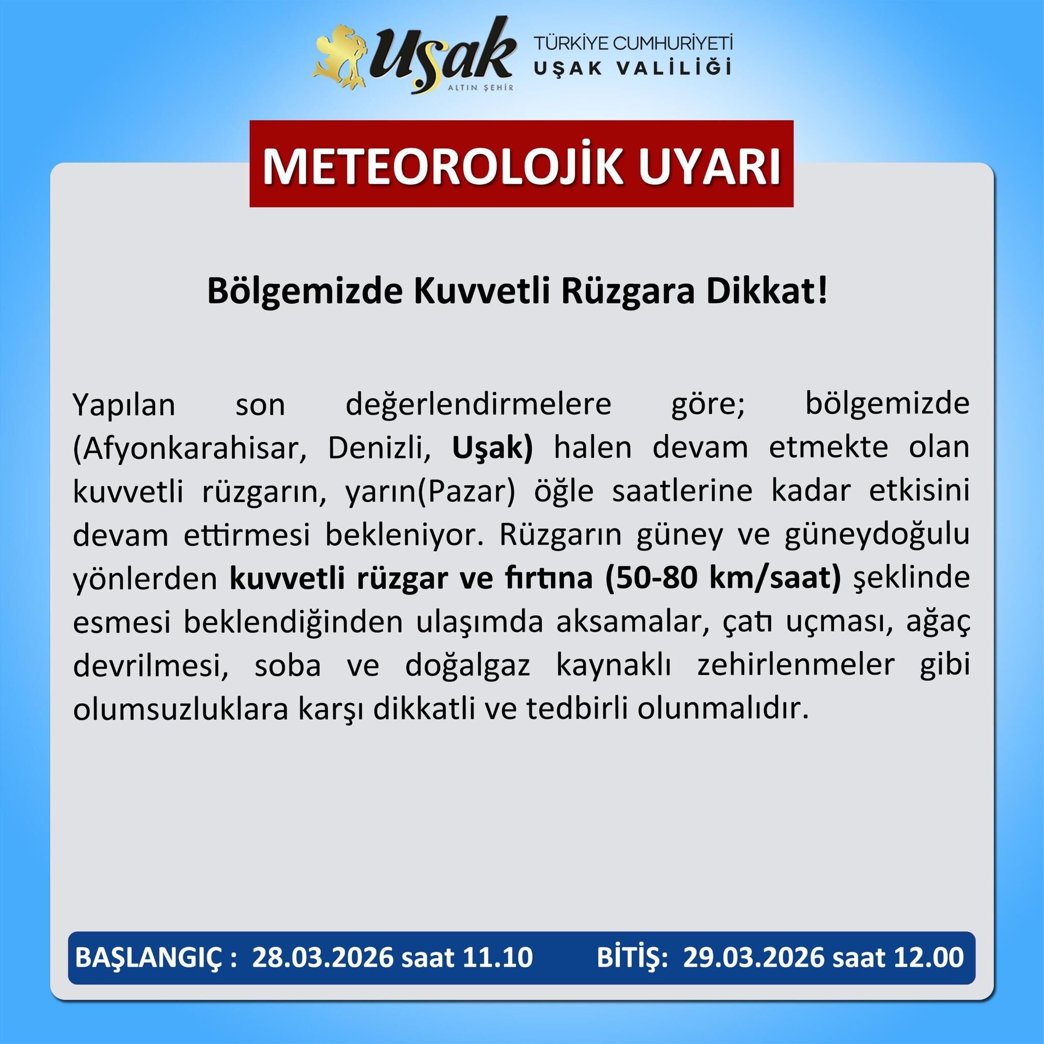 Meteorolojik uyarının başlangıç saati 28 Mart 2026 saat 11.10 olarak açıklanırken, riskin 29 Mart 2026 saat 12.00’ye kadar süreceği bildirildi. Yetkililer, özellikle kırsal alanlarda yaşayan vatandaşların daha dikkatli olması gerektiğini hatırlattı. (Kaynak: Uşak Valiliği)