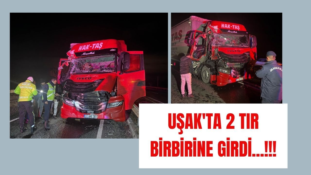 Uşak’ta sabah saatlerinde meydana gelen kazada, Uşak-İzmir kara yolunda aynı yönde seyreden iki tır çarpıştı. Edinilen bilgiye göre, B.A. (42) yönetimindeki 31 AHG 301 plakalı tır, Ürünköy köyü yakınlarında H.T. (57) idaresindeki 03 VL 086 plakalı tırın dorsesine arkadan çarptı.Çarpışmanın etkisiyle kara yolu bir süre trafiğe kapandı. Olayı görenlerin ihbarı üzerine bölgeye sağlık, polis, jandarma ve Karayolları ekipleri sevk edildi. Güvenlik önlemleri alınırken, trafik kontrollü şekilde durduruldu.