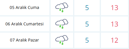 07 Aralık Pazar günü hafif yağmur geçişleri devam edecek. Bu tarihte gündüz sıcaklığı 12 dereceye gerilerken gece 5 derece ölçülecek. Meteoroloji, sürücülerin özellikle sabah saatlerinde oluşabilecek yer yer sis ve görüş azalmasına karşı dikkatli olmasını öneriyor.