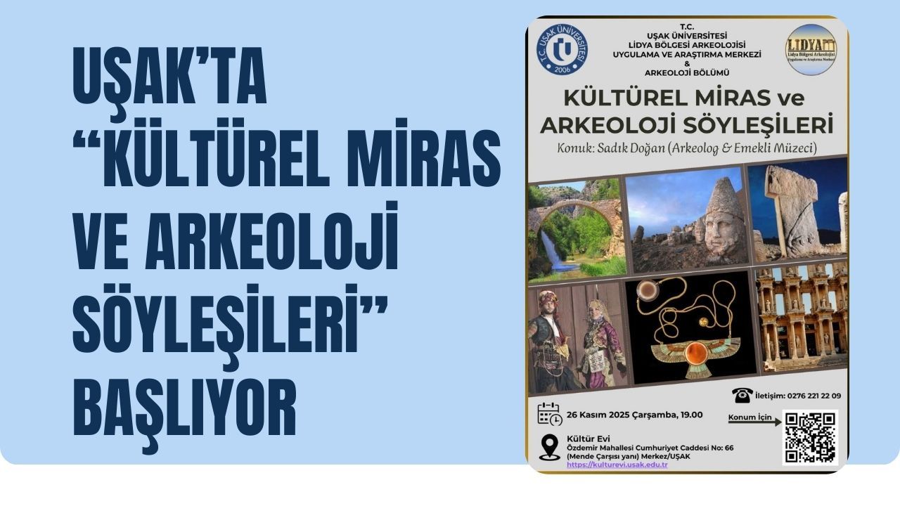 Uşak Üniversitesi Lidya Bölgesi Arkeolojisi Uygulama ve Araştırma Merkezi ile Arkeoloji Bölümü iş birliğinde düzenlenen ‘Kültürel Miras ve Arkeoloji Söyleşileri’nin bu ayki konuğu, deneyimli arkeolog ve emekli müzeci Sadık Doğan olacak. Söyleşi, 26 Kasım 2025 Çarşamba günü saat 19.00’da, Uşak Üniversitesi Kültür Evinde gerçekleştirilecek. Etkinlik, Özdemir Mahallesi Cumhuriyet Caddesi No: 66 (Mende Çarşısı yanı) adresinde yapılacak, katılım ücretsiz olacak.