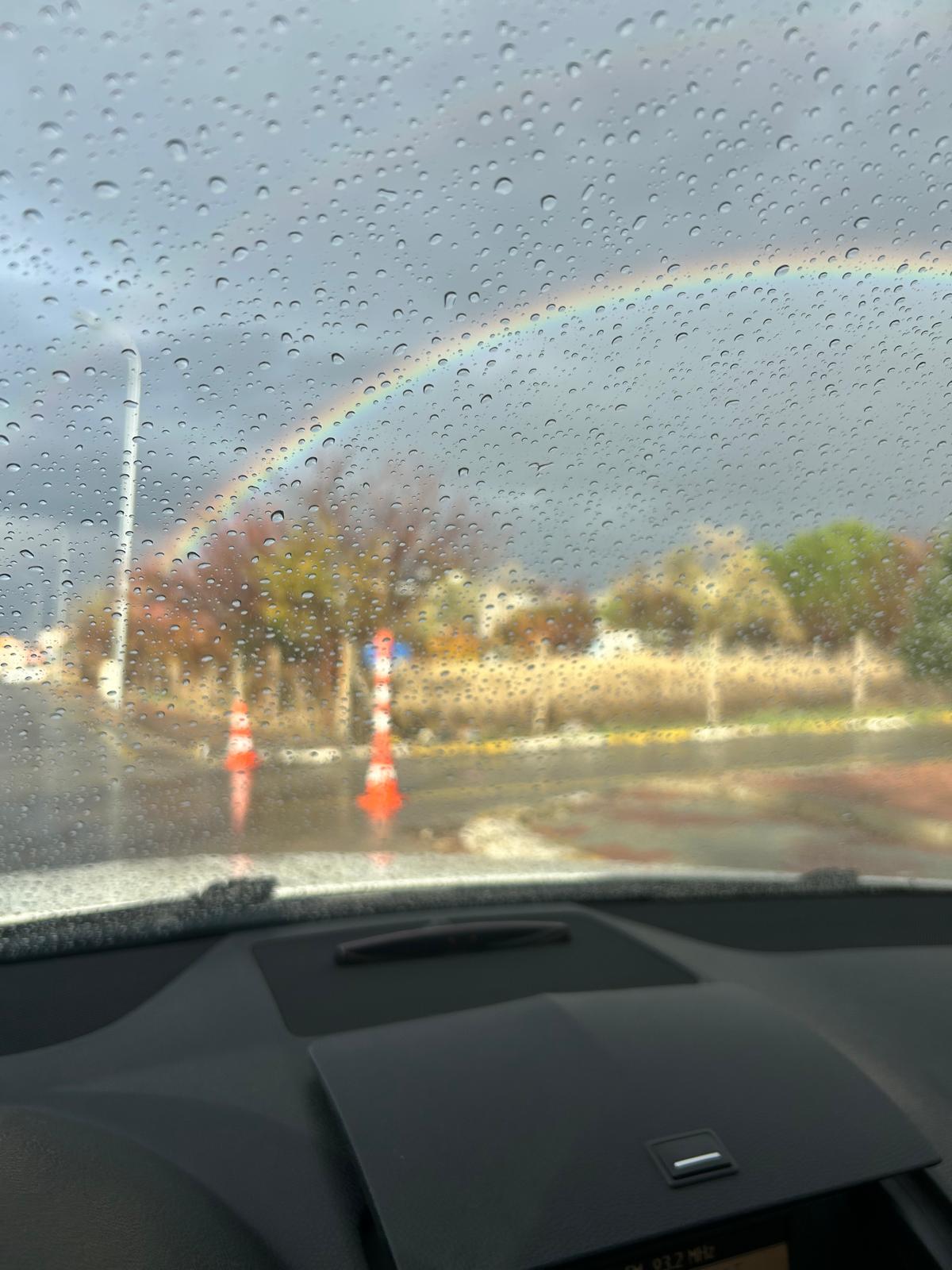 Mahalle üzerinde belirgin şekilde oluşan gökkuşağı, telefon kamerasına yansıyan görüntülerle sosyal medyada da ilgi gördü. Yağmur bulutlarının ardından hızla beliren renk halkası, günün gri havasını aydınlatarak kentte küçük bir sevinç anı yarattı.