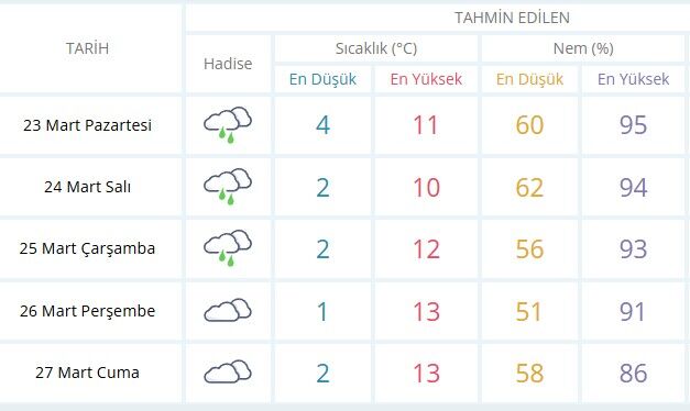 23 Mart Pazartesi günü kent genelinde yağışlı hava etkisini sürdürürken sıcaklıkların en düşük 4, en yüksek 11 derece olması bekleniyor. Nem oranının ise yüzde 60 ile 95 arasında değişeceği tahmin ediliyor.