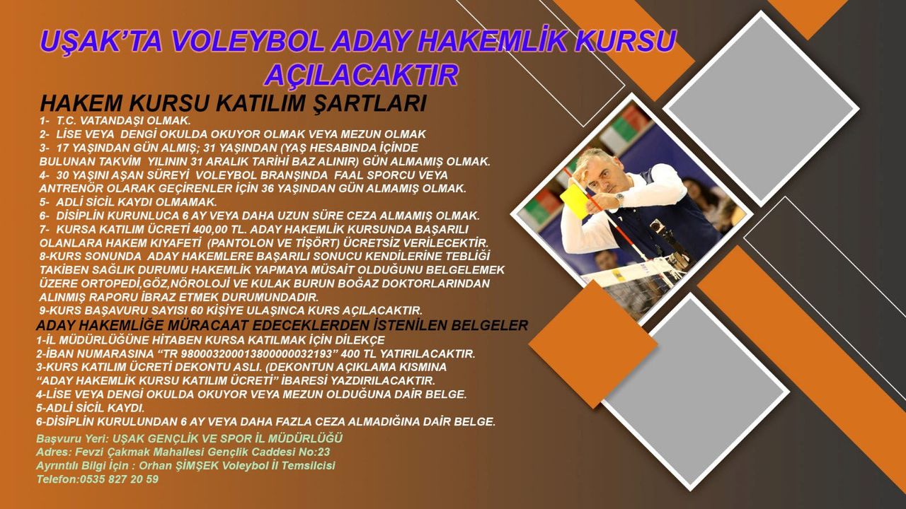 Uşak Gençlik ve Spor İl Müdürlüğü tarafından Voleybol Aday Hakemlik Kursu açılıyor. Gerekli şartları yerine getirecek katılımcılardan istenen belgeleri sizler için yayınlıyoruz. (HASAN BALTA)