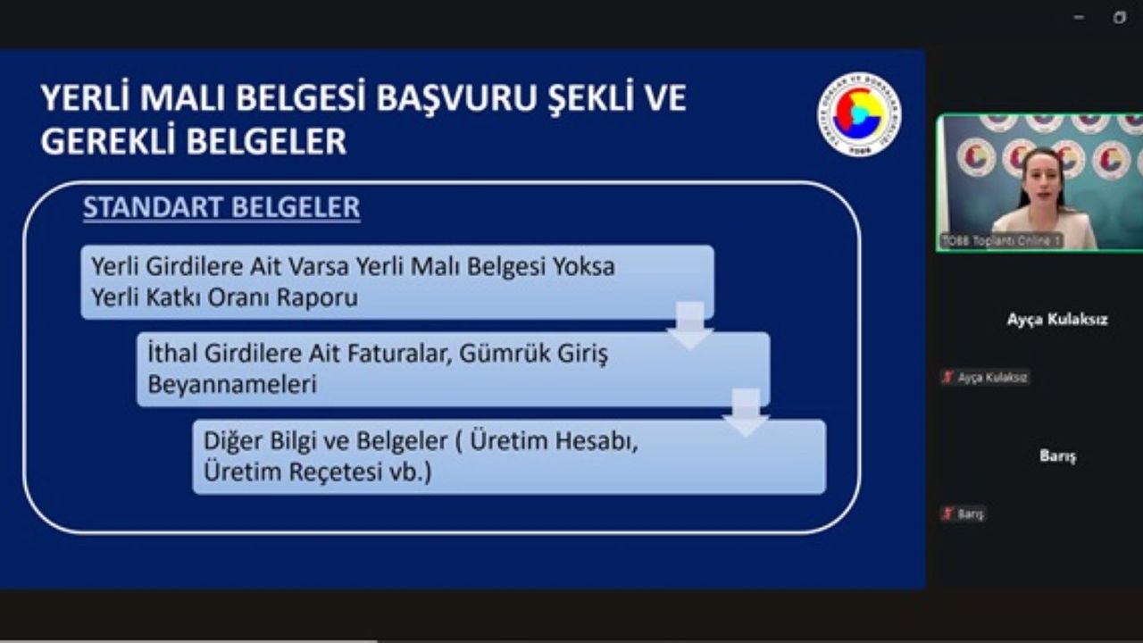 Yerli Malı Belgesinin Düzenlenmesine İlişkin Uygulama Esasları Eğitimi’nin ikincisi, 13 Aralık 2025 tarihinde çevrim içi ortamda düzenlendi. Türkiye genelinden teknik uzman adaylarının katıldığı programda, belgelendirme sürecine dair güncel uygulamalar ayrıntılı biçimde paylaşıldı. Toplantının açılış konuşmalarını Sanayi ve Teknoloji Bakanlığı Sanayi İşbirlikleri Daire Başkanı İbrahim Kütük ile TOBB Sanayi Müdürü Efe Ayden yaptı. Konuşmalarda, yerli üretimin desteklenmesi ve belgelendirme süreçlerinin doğru yürütülmesinin önemi vurgulandı.