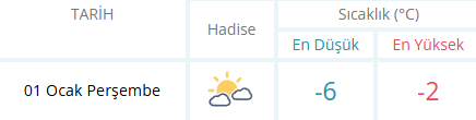 Yeni yılın ilk gününde Uşaklıları sert bir soğuk karşılıyor. Meteoroloji Genel Müdürlüğü’nün paylaştığı tahminlere göre 1 Ocak Perşembe günü kent genelinde hava parçalı bulutlu seyredecek. Günün en düşük sıcaklığı -6 derece, en yüksek sıcaklığı ise -2 derece olarak ölçülecek.