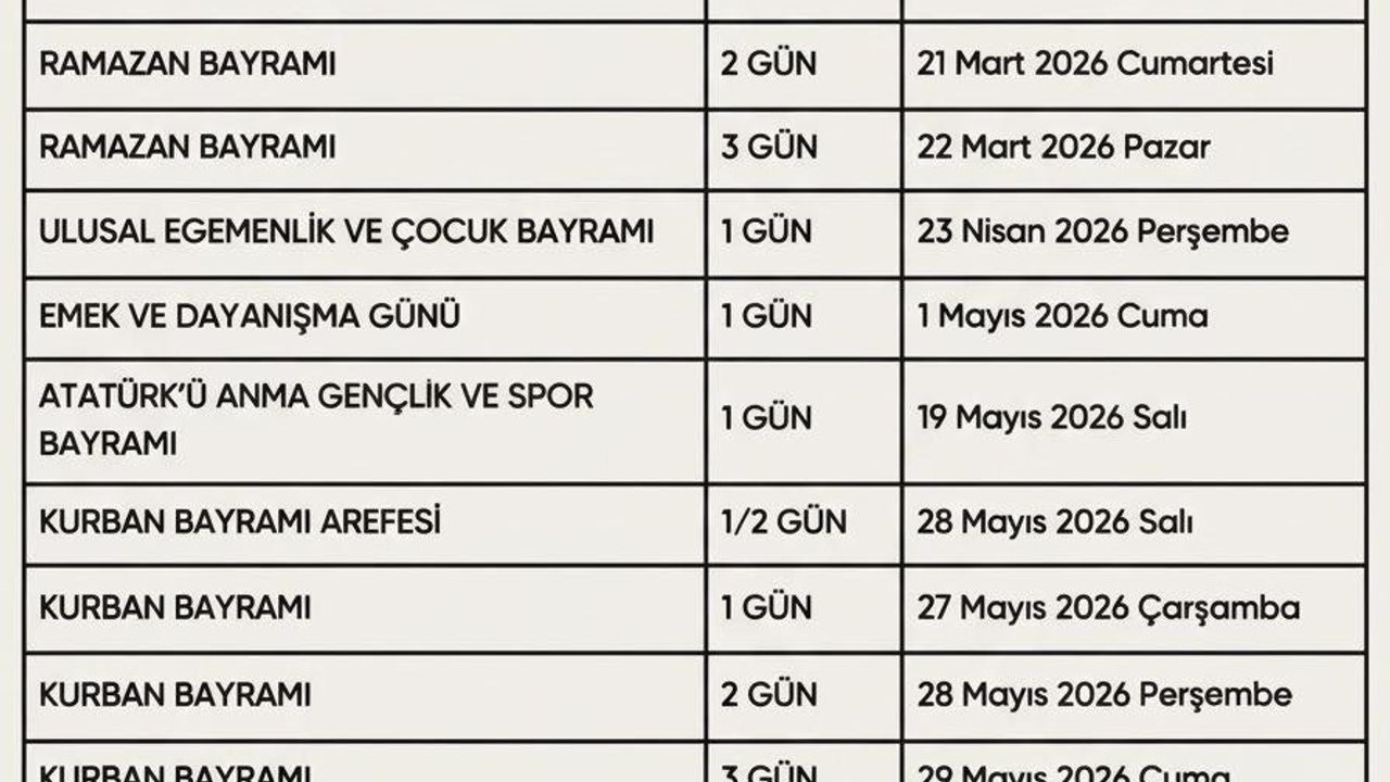 2026 yılına ilişkin ulusal bayram ve genel tatil günleri belli oldu. Yeni takvim, özellikle hafta sonu ile birleşen tatiller sayesinde çalışanlar ve öğrenciler için planlama kolaylığı sağlıyor. Yıl boyunca hem dini hem de milli bayramlarda dinlenme ve seyahat imkânı öne çıkıyor.