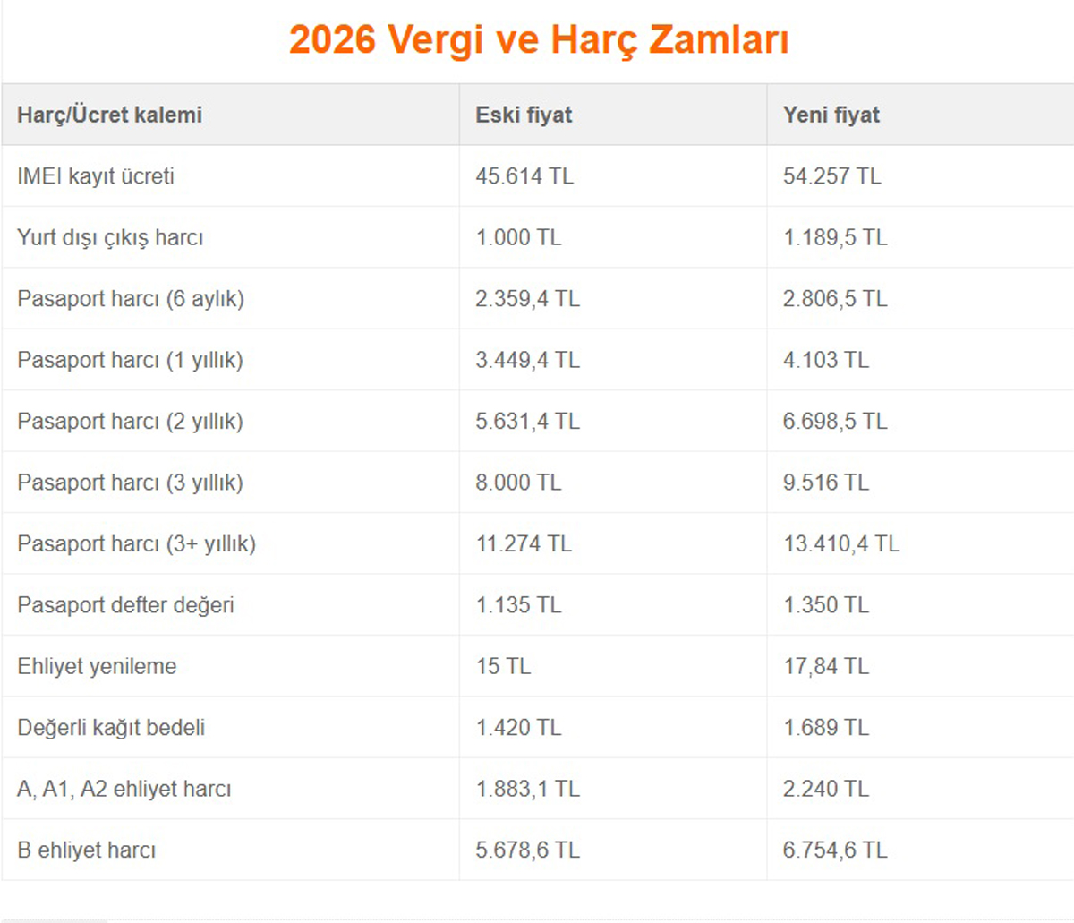 Pasaport, ehliyet, kimlik ve IMEI gibi çok sayıda işlem kalemini kapsayan yeni ücretlerin, 2026 yılı başından itibaren uygulanması bekleniyor. Zam oranı, özellikle yurt dışı işlemleri ve telefon kayıtları nedeniyle vatandaşın bütçesini yakından ilgilendiriyor. 2026’da uygulanacak yüzde 18,95’lik artış oranı, vergi ve harçlarda son yılların en çok konuşulan düzenlemeleri arasında yer aldı. (Kaynak: www.resmigazete.gov.tr)