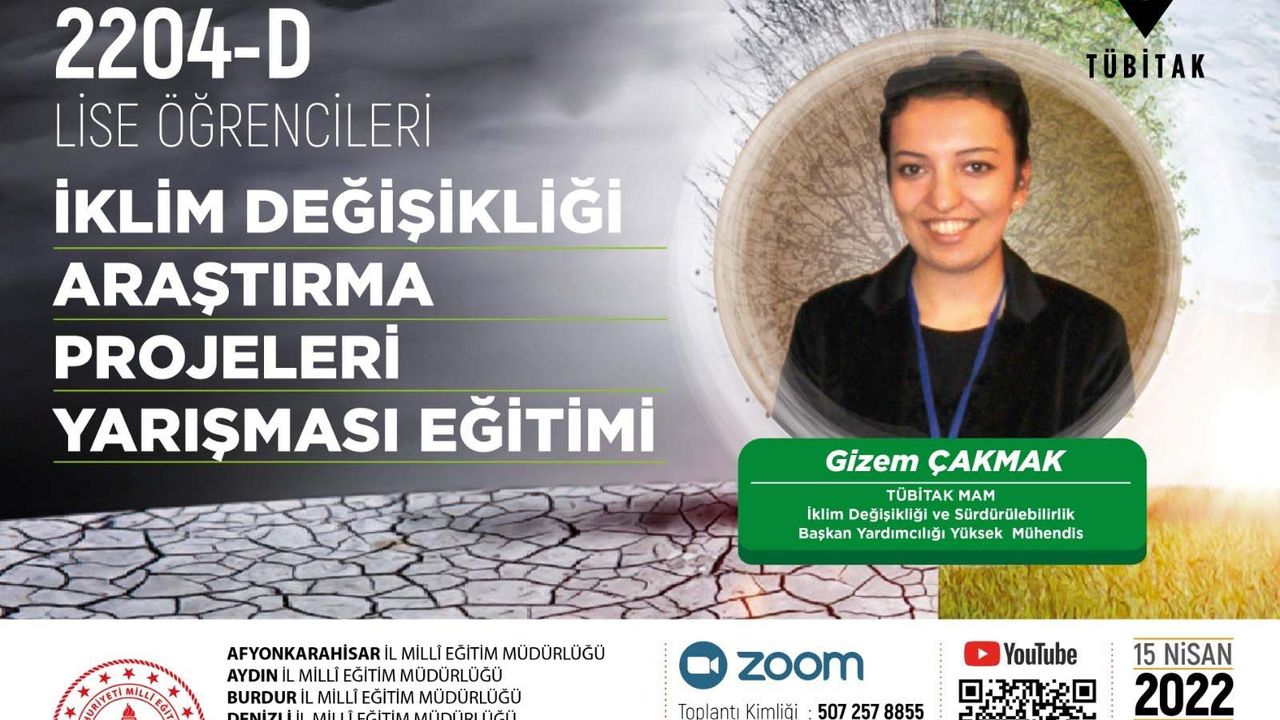 Uşak Milli Eğitim Müdürlüğünden yapılan açıklamada, ‘’TÜBİTAK 2204-D Lise Öğrencileri İklim Değişikliği Araştırma Projeleri Yarışması’na hazırlık amacıyla TÜBİTAK MAM Yüksek Mühendisi Gizem Çakmak'ın sunumu ile gerçekleşecek bilgilendirme toplantımıza davetlisiniz.’’ Denildi.