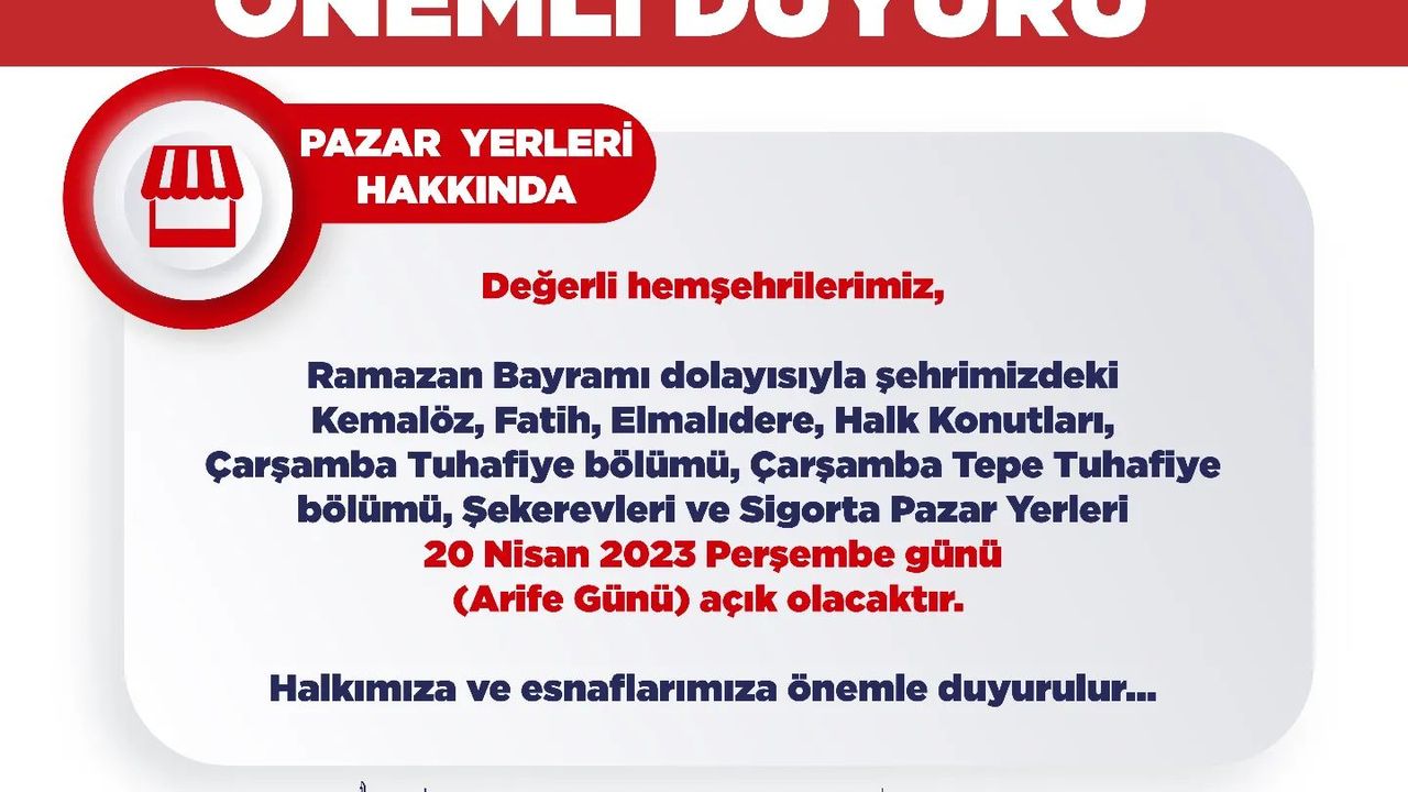 "Değerli hemşehrilerimiz, Ramazan Bayramı dolayısıyla şehrimizdeki Kemalöz, Fatih, Elmalıdere, Halk Konutları, Çarşamba Tuhafiye bölümü, Çarşamba Tepe Tuhafiye bölümü, Şekerevleri ve Sigorta Pazar Yerleri 20 Nisan 2023 Perşembe günü (Arife Günü) açık olacaktır.Halkımıza ve esnaflarımıza önemle duyurulur..." denildi.