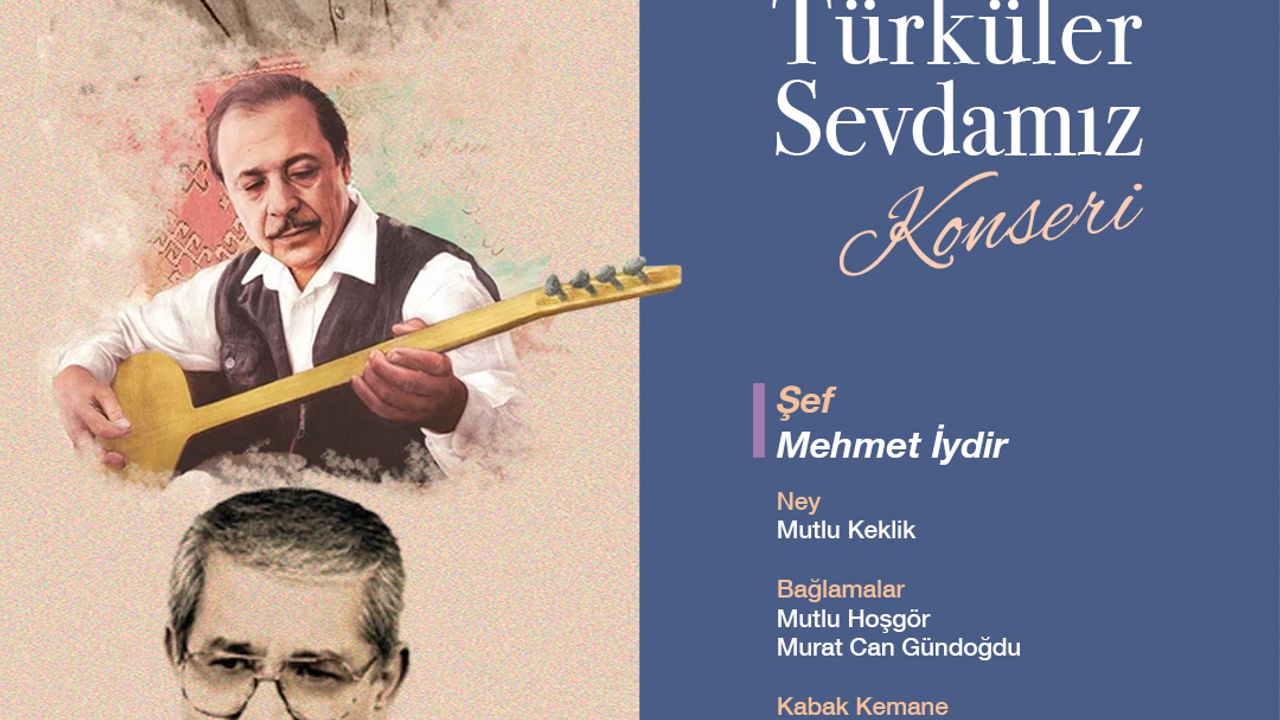 Mehmet İydir şefliğinde gerçekleştirilecek olan konserde Mutlu Keklik-Ney , Mutlu Hoşgör ve Murat Can Gündoğdu bağlama, Hakkı Günaydın-Kabak Kemane , Erkan Semiz -Klavye enstrümanlarını çalacak. Neşet Ertaş ve Aşık Veysel gibi Türk Halk Müziği'nin Ozanları'nın türküleri seslendirilecek. Halil Özkan ve Galip Eşmeli ise türkülerin ritimlerini ayarlayacak. Vatandaşlar , Atatürk Kültür Merkezin'den biletlerini ücretsiz alabilecekler. (SEVAL KANDEMİR)