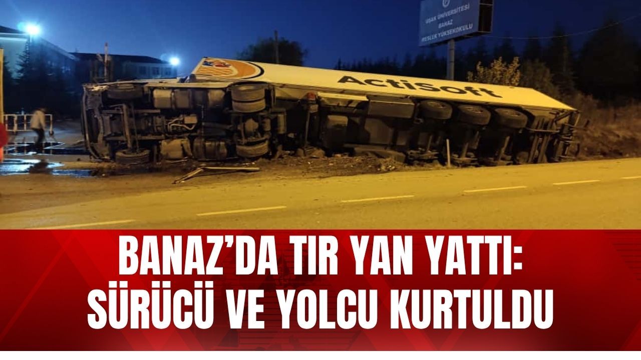 Uşak’ın Banaz ilçesinde sabah saatlerinde meydana gelen trafik kazasında, 34 MLU 924 plakalı tır sürücüsünün direksiyon hakimiyetini kaybetmesi sonucu Banaz Meslek Yüksekokulu önünde yol kenarına yan yattı. Kazayı gören çevredeki vatandaşlar durumu hemen 112 Acil Çağrı Merkezi’ne bildirdi. Olay yerine sağlık, polis ve itfaiye ekipleri kısa sürede sevk edildi. Yapılan ilk incelemelere göre tır sürücüsü ile araçta bulunan yolcu herhangi bir yara almadan kazayı atlattı.