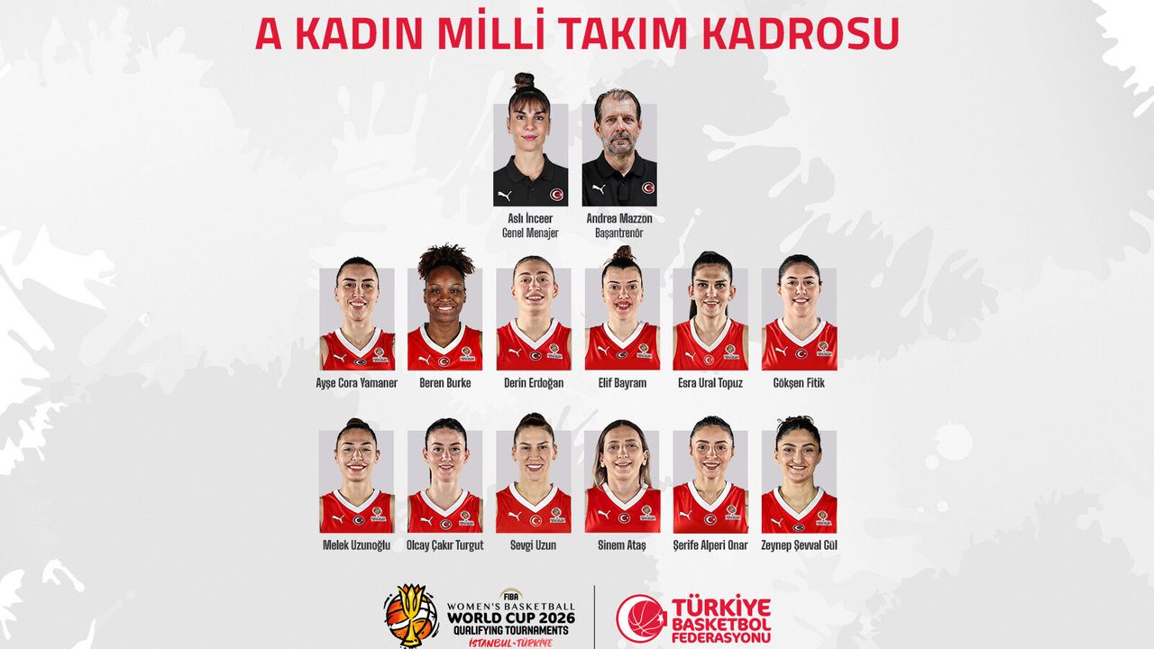 FIBA 2026 Kadınlar Basketbol Dünya Kupası Elemeleri’nde mücadele edecek A Kadın Milli Basketbol Takımı’nın 12 kişilik kadrosu açıklandı. Ay-yıldızlı ekip, dünya kupasına katılma hedefiyle eleme turnuvasında parkede olacak. Türkiye Basketbol Federasyonu tarafından açıklanan kadroda hem tecrübeli hem de genç oyuncular yer alırken, millî takımın eleme sürecinde güçlü bir performans ortaya koyması hedefleniyor.