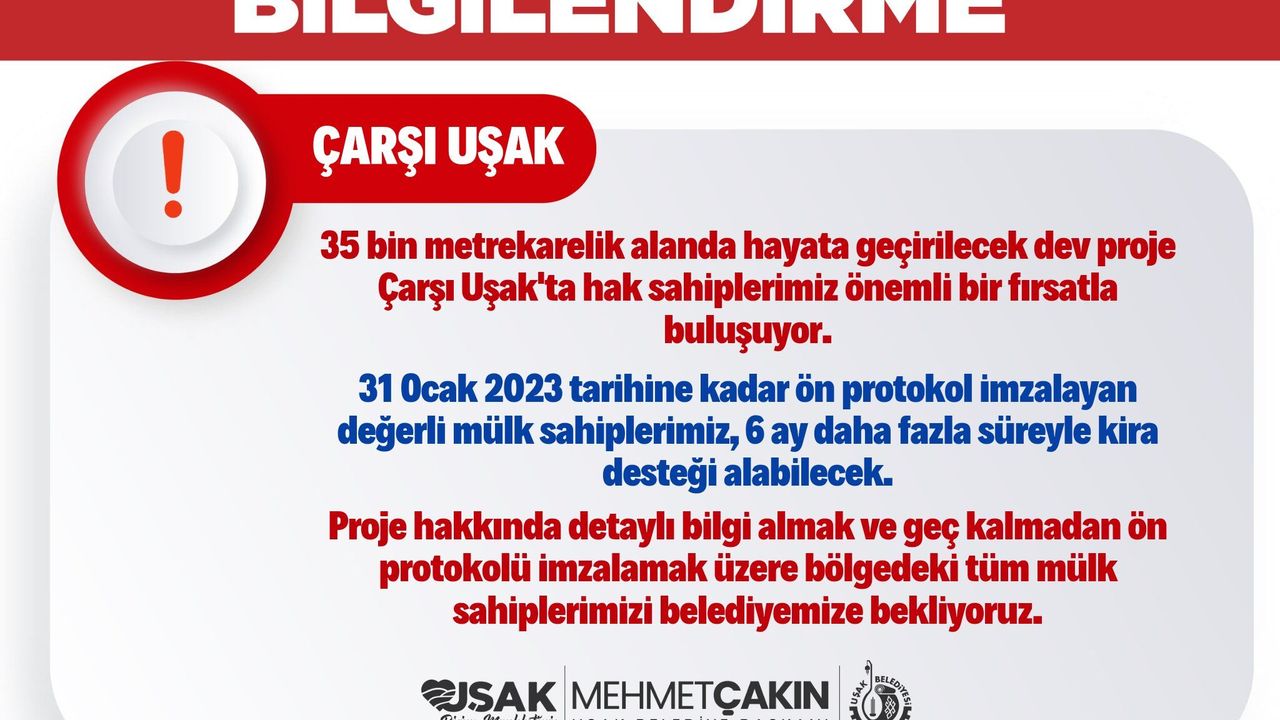 Uşak Belediyesinden yapılan açıklamada, ‘’Kentimize ve bölgeye değer katacak Çarşı Uşak Projesi'nde hak sahiplerimizi özel bir fırsat bekliyor.
