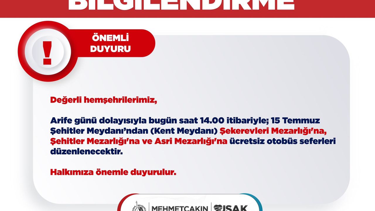 Uşak Belediyesi yaptığı açıklama ile ''Değerli hemşehrilerimiz, Arife günü dolayısıyla bugün saat 14.00 itibariyle; 15 Temmuz Şehitler Meydanı’ndan (Kent Meydanı) Şekerevleri Mezarlığı'na, Şehitler Mezarlığı'na ve Asri Mezarlığı'na ücretsiz otobüs seferleri düzenlenecektir. Halkımıza önemle duyurulur.'' denildi.(emine yetim)