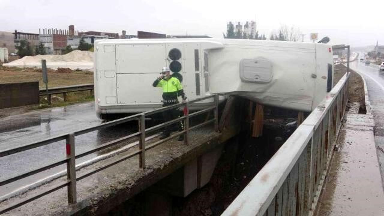 Kontrolü kaybeden işçi servisi orta refüjde bulunan köprü bariyerlerine çarparak yan devrildi. Can pazarının yaşandığı hazada servis içerisinde bulunan 9 işçi ve şoför yaralandı.