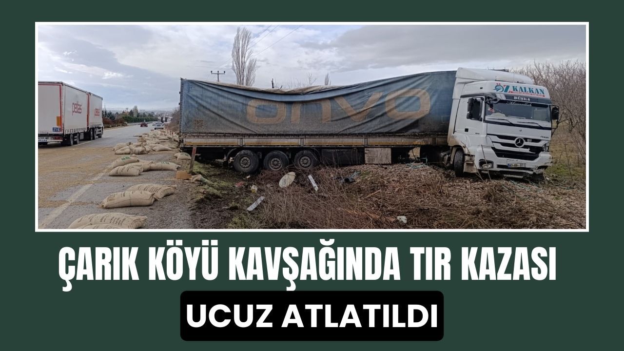 Uşak-Banaz Karayolu’nun Çarık Köyü kavşağında meydana gelen trafik kazası, bölgede kısa süreli paniğe neden oldu. Edinilen bilgilere göre, 47 KG 011 plakalı TIR, seyir halindeyken lastiğinin patlaması sonucu kontrolden çıktı ve yol kenarındaki tarlaya savruldu. Kazanın etkisiyle TIR’ın kasasında bulunan bir araç ile çok sayıda çuval yola ve çevredeki araziye dağıldı. Olayı gören vatandaşların ihbarı üzerine bölgeye jandarma, trafik ve sağlık ekipleri sevk edildi.