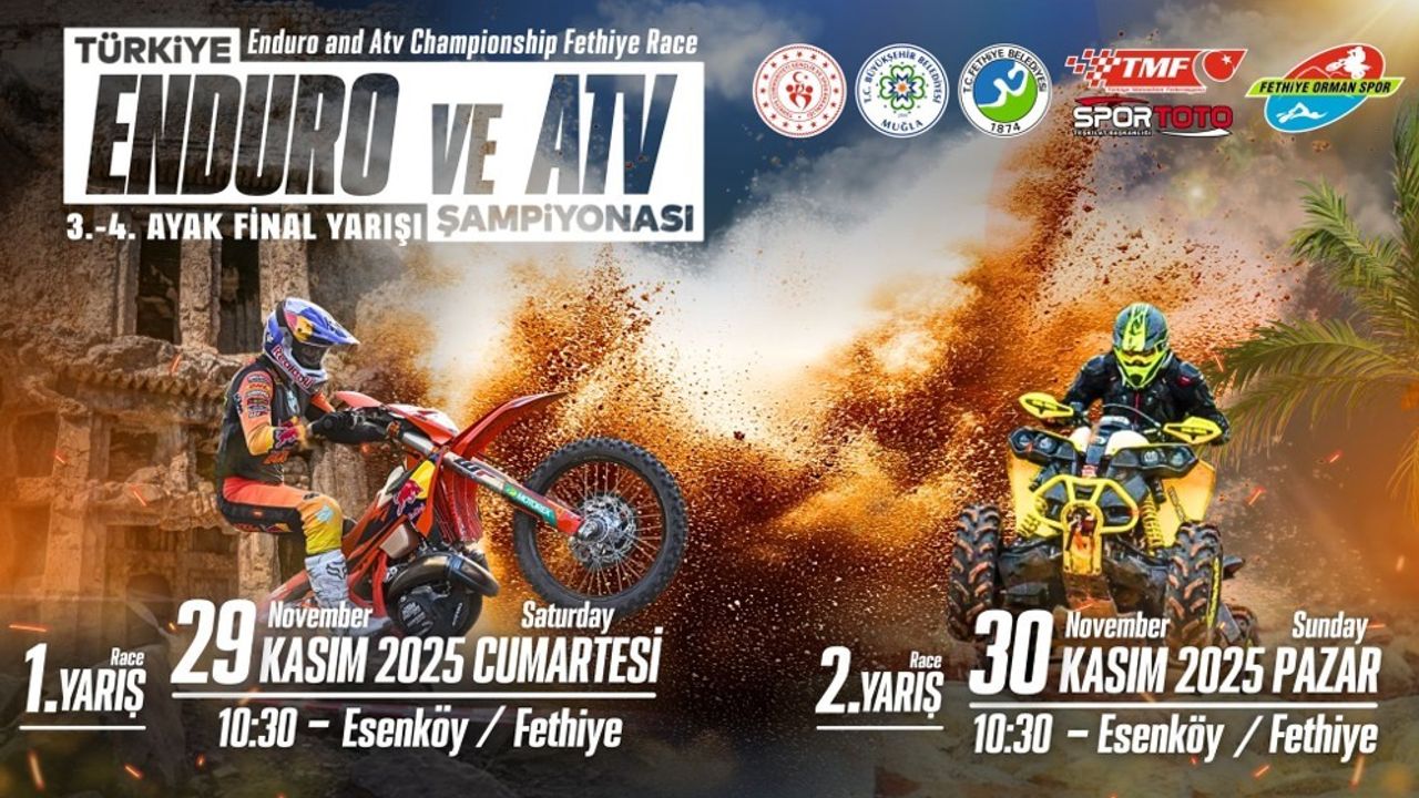 Türkiye Enduro ve ATV Şampiyonası’nda heyecan, Muğla’nın Fethiye ilçesinde düzenlenecek çifte yarışla sona erecek. Fethiye Akdeniz Offroad Park, yılın son etaplarına ev sahipliği yaparak Türkiye’nin dört bir yanından gelen sporcuları ağırlayacak. Final programı iki ayak olarak planlandı. EnduroGP, E1, E2, E3, E1B, E2B, E3B, EC, Veteran, Kadınlar, Gençler, A1 ve A2 sınıflarında mücadele eden sporcular, hem teknik etaplarda hem de dayanıklılık gerektiren parkurlarda derece arayacak.