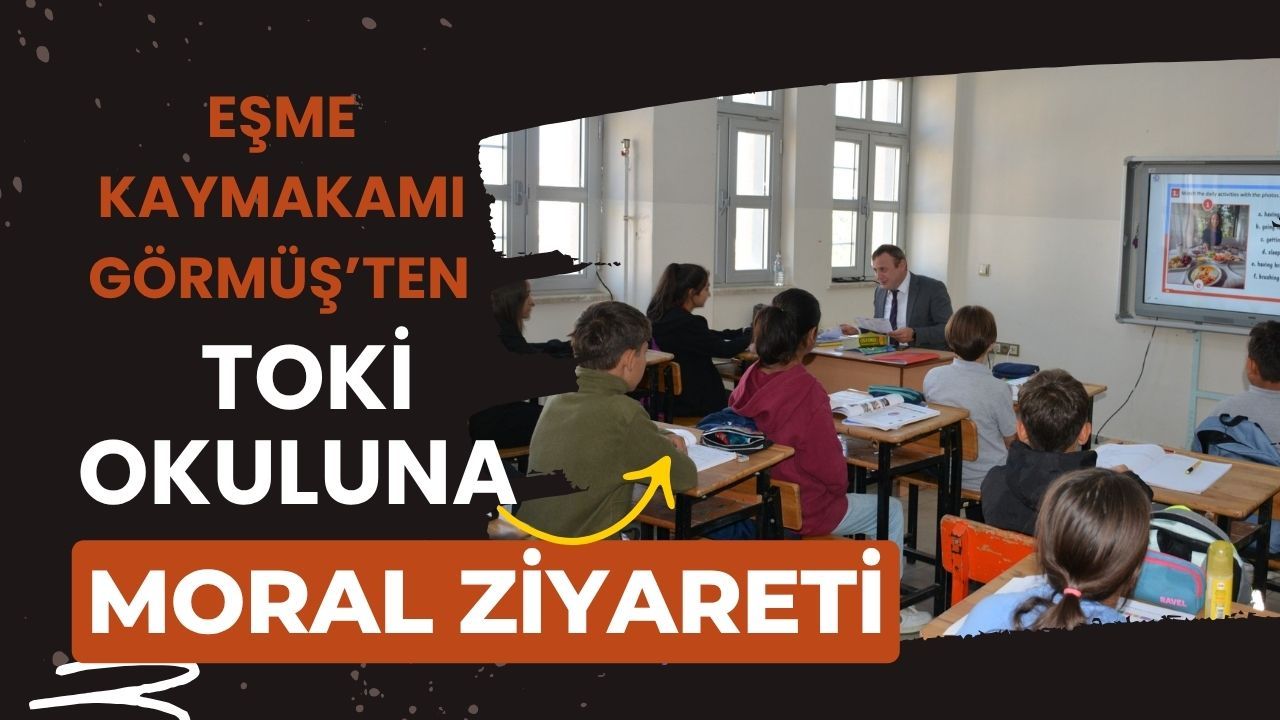 Uşak’ın Eşme ilçesinde eğitim kurumlarına verilen destek sürüyor. Eşme Kaymakamı Mustafa Görmüş, beraberinde kurum amirleriyle birlikte Toki İlk/Ortaokulu’nu ziyaret ederek öğrenci ve öğretmenlerle buluştu. Sınıfları tek tek gezen Kaymakam Görmüş, öğrencilerle sohbet ederek dersleri ve hedefleri hakkında sorular sordu. Öğrencilerden çok çalışmalarını isteyen Görmüş, tüm öğrencilere başarılar diledi.