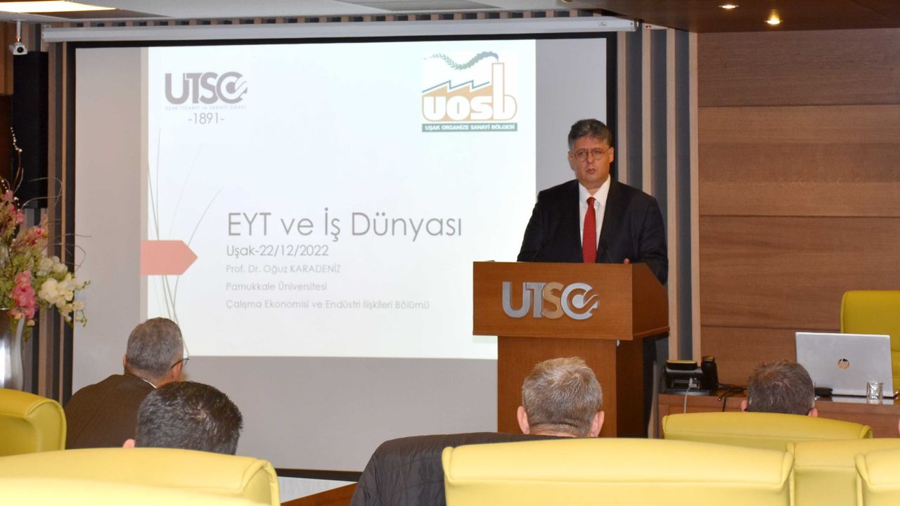 Emeklilikte Yaşa Takılanlar (EYT) ile ilgili mevcut bilgilerin paylaşıldığı, sanayicileri bekleyen risklerin ve bu risklere karşı alınabilecek önlemlerin değerlendirildiği "EYT ve İşletmelerde İşgücü Planlaması" konulu bilgilendirme toplantısı Pamukkale Üniversitesi Çalışma Ekonomisi ve Endüstri İlişkileri Bölüm Başkanı Prof. Dr. Oğuz Karadeniz'in sunumuyla Uşak Ticaret ve Sanayi Odasında (UTSO) gerçekleştirildi.