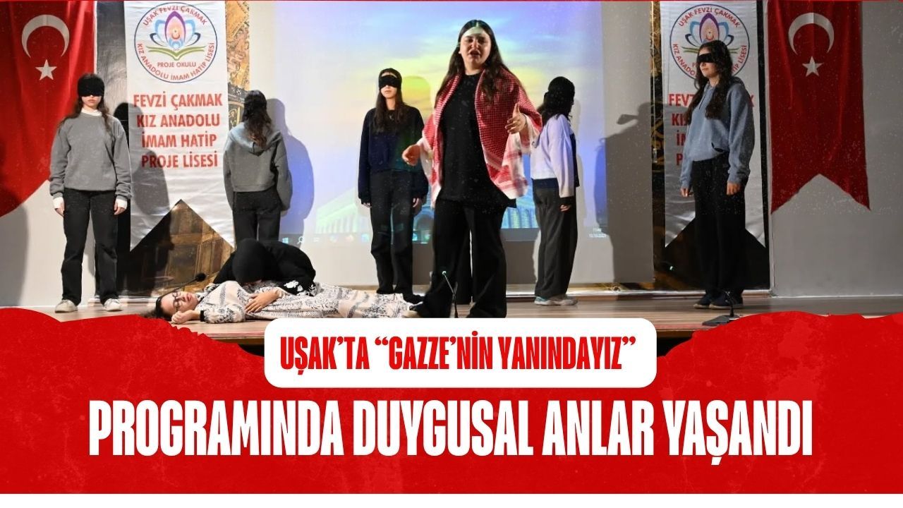 Uşak İl Millî Eğitim Müdürlüğü tarafından desteklenen “Gazze’nin Yanındayız” programı, Fevzi Çakmak Kız Anadolu İmam Hatip Lisesinde öğrencilerin yoğun katılımıyla gerçekleştirildi. Programa İl Milli Eğitim Müdürü Halil Yücel de katılarak öğrencilerin hazırladığı anlamlı etkinlikleri yerinde izledi.