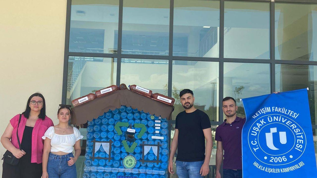 Uşak Üniversitesi İletişim Fakültesi Halkla İlişkiler ve Reklamcılık bölümü 3.sınıf öğrencileri Muhlis Can Şimşek, Saide İlayda Araz, Emine Bülbül ve Kerem Boz geçtiğimiz aylarda Halkla İlişkiler Kampanyaları dersi adı altında, geri dönüşümün önemi ve teşvik edilmesiyle ilgili Bir Eylül İlkokulu’nda kampanya düzenlemişlerdi. Projenin ikinci etkinliği olarak bu kez de 1000 atık pet şişe kullanarak ev görünümünde geri dönüşüm otomatı yaptılar. Ev görünümünün orta kısmındaki bölümden atılan pet şişeler, yaptıkları boru yardımıyla evin arkasındaki pet şişelerden tasarlanan kutuya ulaşacak. Sloganları olan ‘’Geleceği Düşünelim Geri Dönüşümü Önemseyelim’’ ve tasarladıkları logoyu evin tasarımında kullandılar. Otomat şeklinde tasarlanan ve ilgi çeken bu anıt ev, Uşak Üniversitesi yemekhanesinde sergilendi. Öğrenciler projelerinin önünde fotoğraf çekildi.