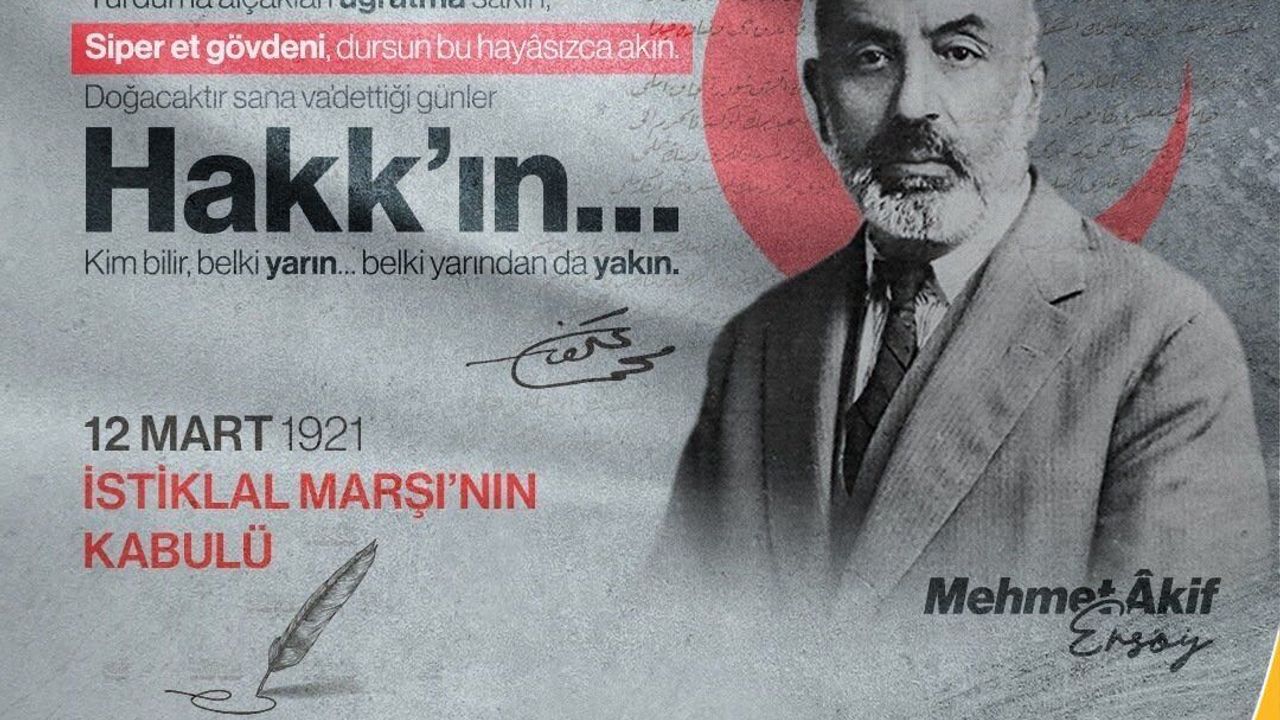 İstiklal Marşı'mızın kabulünün 102. yılını kutluyor, bu vesile ile büyük şair Mehmet Âkif Ersoy ve Milli Mücadelemizin tüm kahramanlarını rahmet ve duayla anıyorum. “Allah bu millete bir kez daha İstiklal Marşı yazdırmasın.” Amin…’’ ifadelerini kullandı. (BERRİN BAKIRCI)