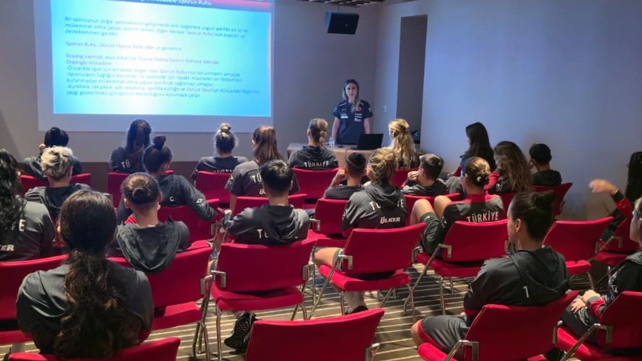 UEFA Kadınlar Uluslar B Ligi Play-Out maçlarına hazırlanan Kadın A Milli Takımımız, hazırlıklarını Hasan Doğan Milli Takımlar Kamp ve Eğitim Tesisleri'nde sürdürüyor. Ay-Yıldızlı ekibimize bu sabah dopingle mücadele eğitimi verildi. TFF Dopingle Mücadele Kurulu tarafından organize edilen ve Takım Doktoru Ceylan Köksal tarafından verilen eğitimde; “Doping nedir, yasaklılar listesi, futbolcunun dopingden korunmak için dikkat etmesi gerekenler, dopingle mücadelede kural ihlalleri, ergojenik destek ürünlerinin doping açısından riskleri” konuları işlendi.
