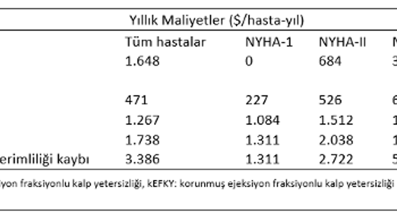 Çalışmada, kalp yetersizliği hastalarının yüzde 51,4'ünün düşük ejeksiyon fraksiyonlu kalp yetersizliği (dEFKY), yüzde 29,1'inin korunmuş ejeksiyon fraksiyonlu kalp yetersizliği (kEFKY) ve yüzde 19,5'inin hafif azalmış ejeksiyon fraksiyonlu kalp yetersizliği (hEFKY) hastası olduğu belirtiliyor. Doğrudan tıbbi maliyet, dEFKY hastalarında yıllık hasta başı 1.147 dolar olurken bu maliyet kEFKY hastalarında 649 dolar, hEFKY hastalarında ise 555 dolar olarak belirlendi. Buna göre, dEFKY hastalarının tedavi yönetiminin kEFKY ve hEFKY hastalarına göre daha yüksek bir doğrudan tıbbi maliyet ile ilişkili olduğu ortaya kondu. Çalışmada yer alan bulgular, ileri kalp yetersizliği evreleri ile maliyetlerin arttığını gösterirken kalp yetersizliğinin daha fazla ilerlemesini önlemenin önemini ortaya koyuyor. (HABER MERKEZİ)