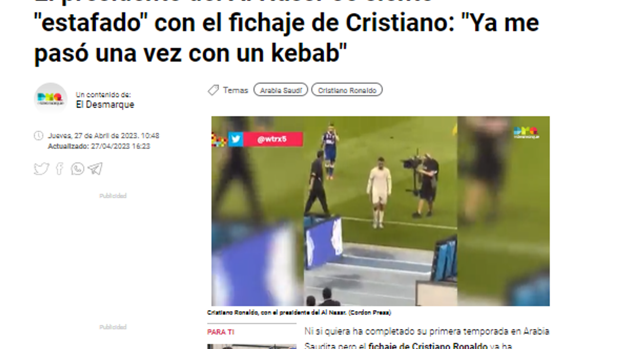 Al-Muammar, ArabiaNews50'ye "Hayatımda yalnızca iki kez dolandırıldım. İlki, üç sıra kebap istediğimde yalnızca iki sıra gönderdikleri gündü. İkincisi, Cristiano Ronaldo ile sözleşme imzaladığım gündü" açıklamasını yaptı. Bu sözler kısa süre içinde dünya basınında gündeme oturdu. Al-Nassr, Riyad Süper Kupası, Suudi Arabistan Süper Kupası ve Suudi Arabistan Kral Kupası'ndan elendi. Suudi Arabistan Ligi'nde de liderliği Al-Ittihad'a kaptırdılar. Ronaldo geçtiğimiz günlerde maç bitiminde "Messi" tezahüratı yapan taraftarlara kasığıyla hareket çekmişti.400 MİLYON DOLAR