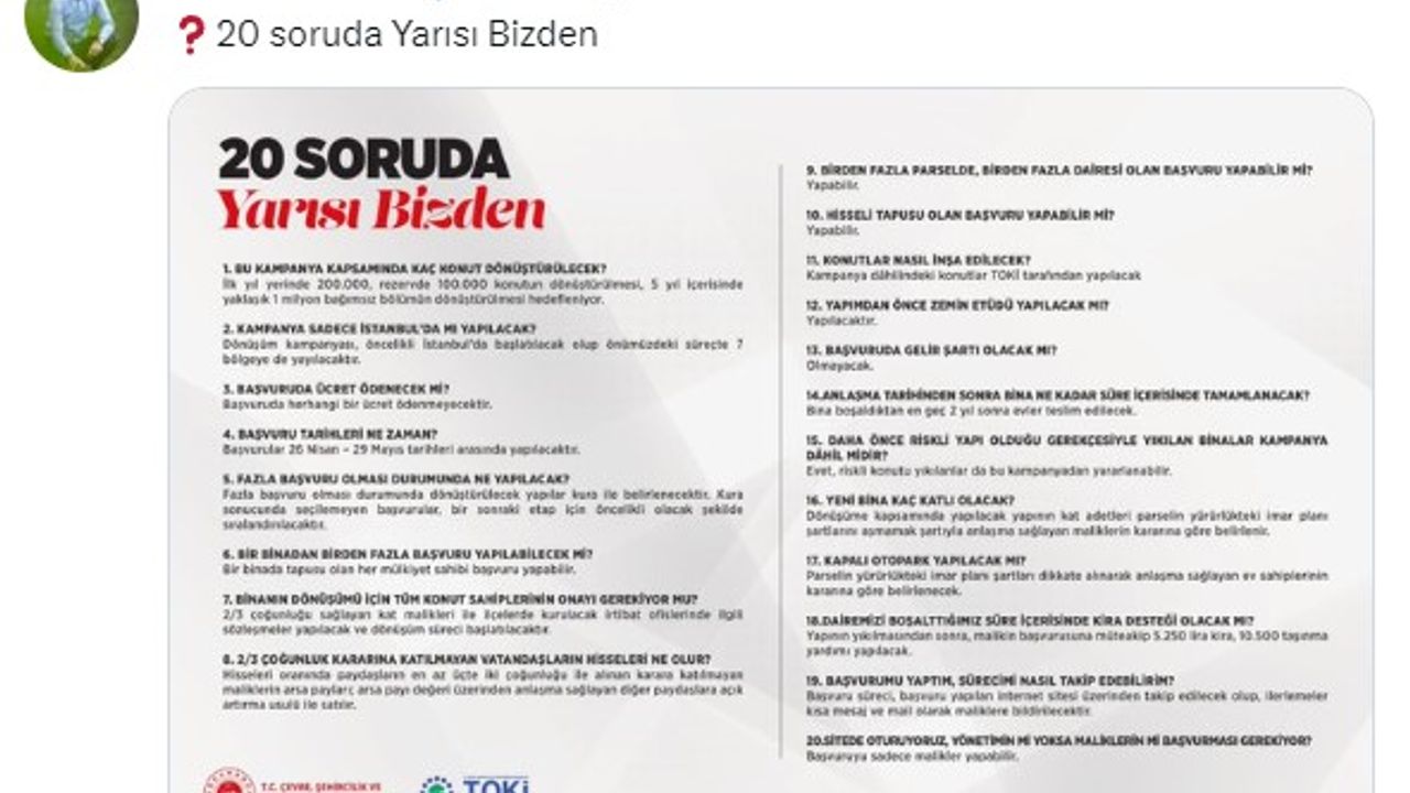 Heyecan yaratan açıklamanın ardından bugün de Çevre, Şehircilik ve İklim Değişikliği Bakanı Murat Kurum, kampanyanın detaylarını açıkladı. Sosyal medya hesabından bir paylaşım yapan Kurum, "20 soruda Yarısı Bizden" notuyla en çok merak edilen soruları cevaplandırdı.