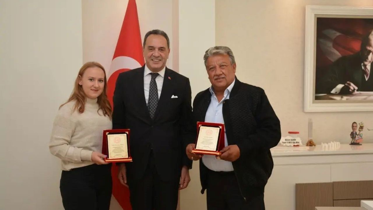İl Milli Eğitim Müdürlüğü binasına resimleri ile süsleyen ressam Ziya Güvenç ve Görsel Sanatlar öğretmeni Pınar Güvenç’e katkılarından dolayı Milli Eğitim Müdürü Bülent Şahin tarafından plaket verildi.