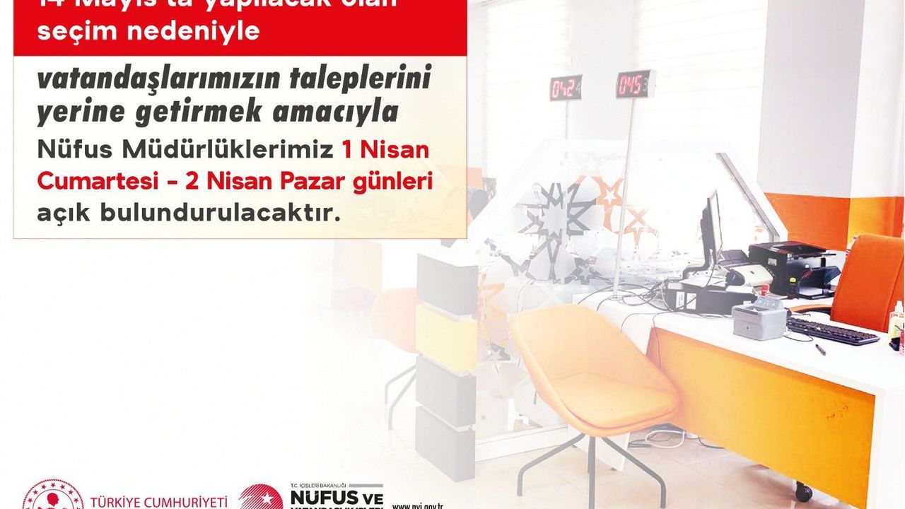 Adres işlemlerinizi gerçekleştirebilmeniz için; 1 Nisan Cumartesi - 2 Nisan Pazar günleri nüfus müdürlüklerimiz hizmetinizde..